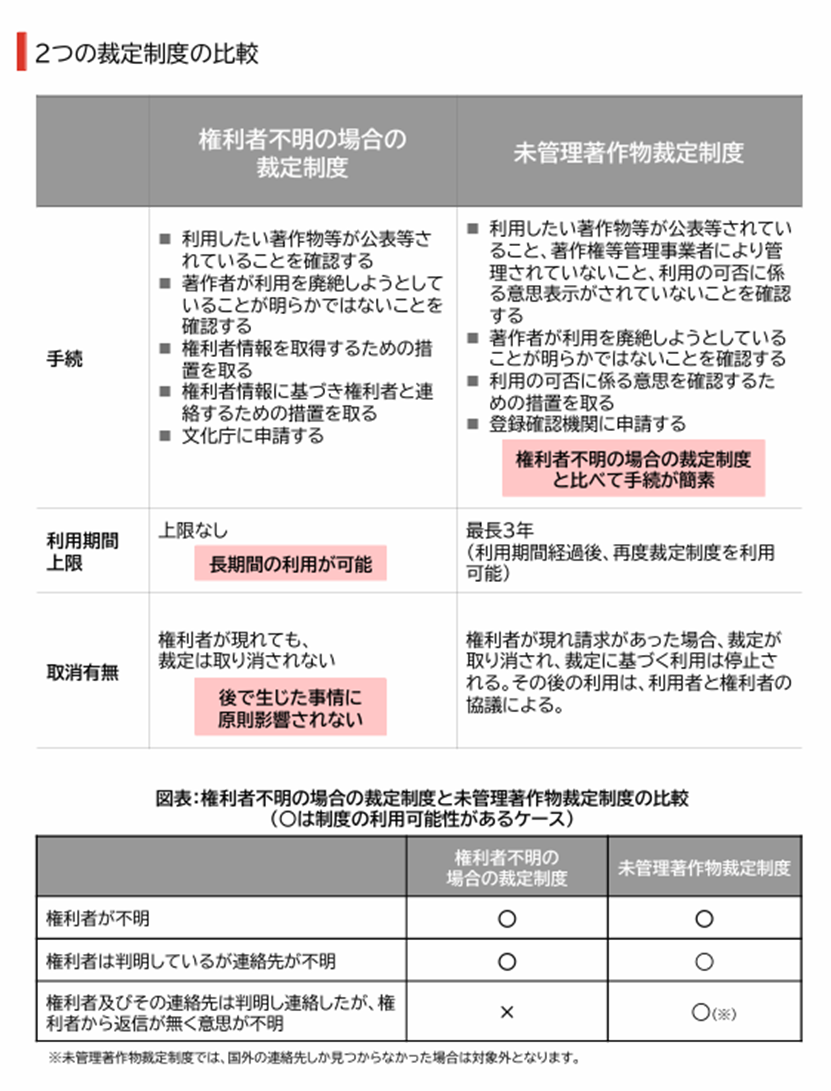 ところで、上記の未管理著作物裁定制度に加えて、従前から存在する裁定制度に「著作権者不明等の場合の裁定制度」というものが存在します。例えば、「権利者が誰か分からない」、「(権利者が誰か分かったとしても)権利者の所在が分からない」、「亡くなった権利者の相続人が誰なのか、またその所在が分からない」等の理由で許諾を得ることができない場合に、権利者の許諾を得る代わりに文化庁長官の裁定を受け、通常の使用料額に相当する補償金を支払うことにより、著作物等の適法な利用を可能とする制度です。以下は、これら2つの裁定制度を比較した表です。