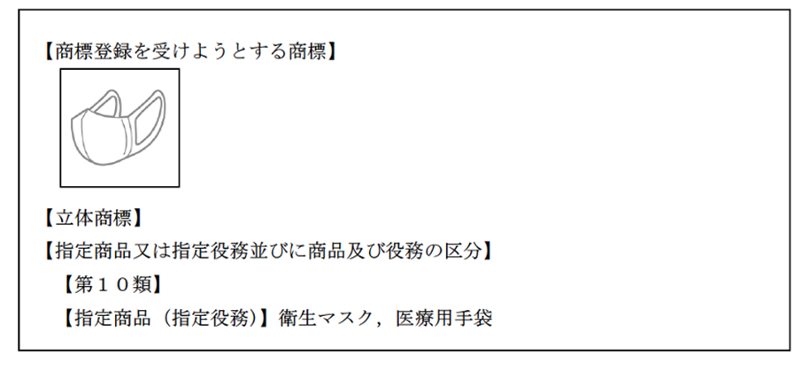 上掲の事例では、商標登録を受けようとする商標記載欄に衛生マスクの立体的形状を表し、指定商品として「衛生マスク」と「医療用手袋」が記載されています。この場合、「衛生マスク」以外の指定商品が当該立体的形状を採ることは想定し得ず、かつ、広告として使用されることも当然に想定し得ないとして、3条1項柱書に基づく拒絶理由に該当するとされています。
